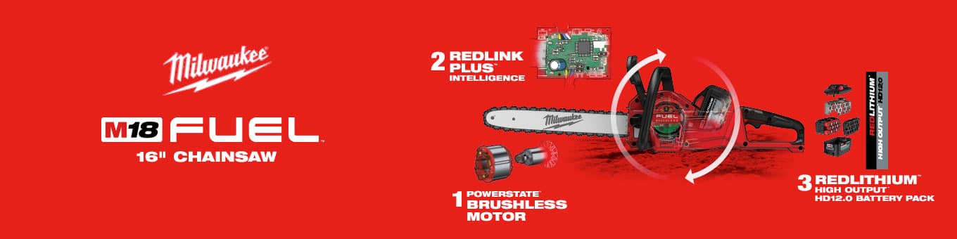 The Milwaukee M18 FUEL 16 in. cordless chainsaw delivers the power to cut hardwoods, cuts faster than gas-powered models and delivers up to 150 cuts per charge. The battery powered chainsaw is designed to meet the performance, durability and ergonomic needs of professional landscape maintenance, power utility and the installed M18 users. M18 FUEL technology allows the unit to reach full throttle in under 1 second providing the ultimate control and productivity. The POWERSTATE Brushless Motor was purposely built for the M18 FUEL 16 in. Chainsaw to provide the power and performance of a gas engine up to 40 cc. Built-in REDLINK PLUS Intelligence ensures optimal tool performance and provides overload protection to prevent damage to the tool and battery during heavy applications while still maintaining compatibility across the entire M18 System. The REDLITHIUM High Output HD12.0 Battery Pack provides 50% more power and runs 50% cooler versus standard REDLITHIUM HD packs. Superior pack construction provides the industry's best protection against jobsite weather and environmental conditions. In addition to the chainsaw, this kit comes with one M18 REDLITHIUM High Output HD12.0 battery pack (48-11-1812), one M18/M12 multi-volt rapid charger (48-59-1808), one 16 in. Oregon bar and chain and 1 scrench.